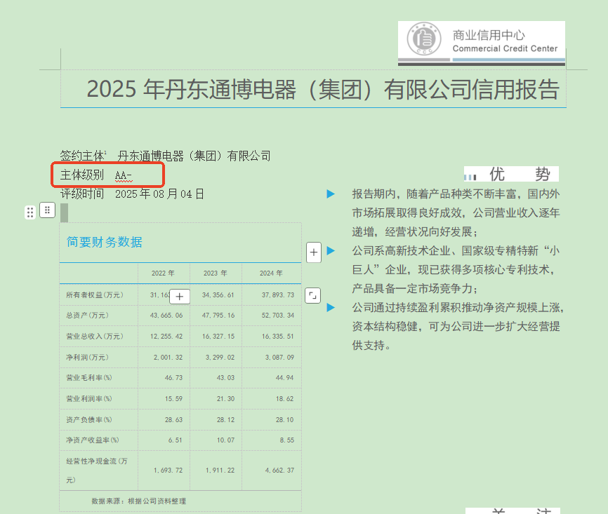 親愛的伙伴們,今天要給大家分享一個(gè)超振奮的消息!丹東通博電器(集團(tuán))有限公司易派客法人信用認(rèn)證實(shí)現(xiàn)重磅升級(jí),從原先的 A+ 躍升至 AA- 啦 !這一跨越,是公司發(fā)展歷程中又一閃耀里程碑,更是市場與權(quán)威機(jī)構(gòu)對(duì)通博實(shí)力的深度認(rèn)可。